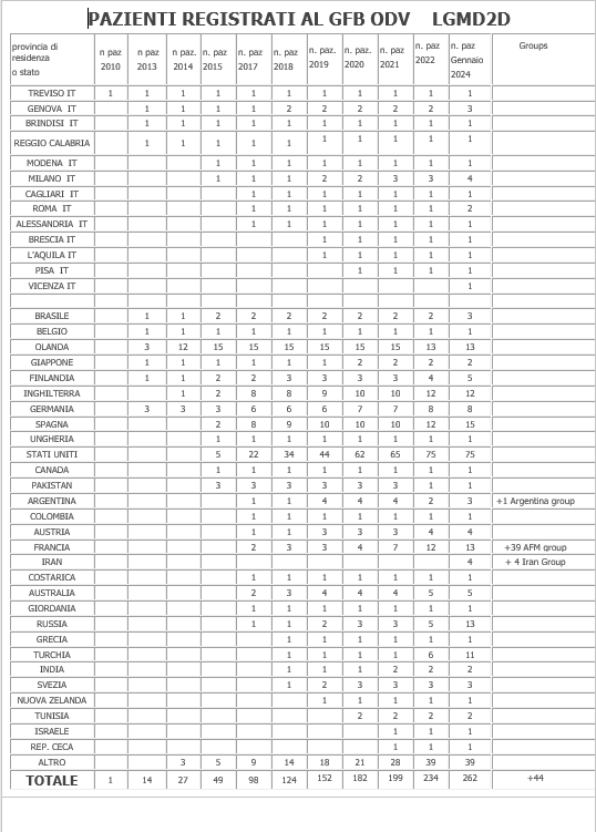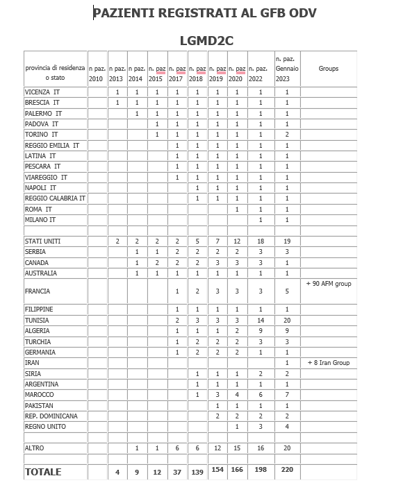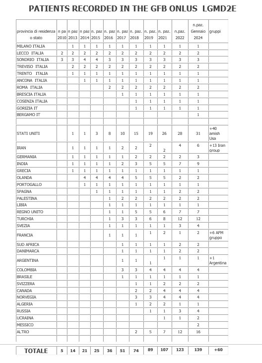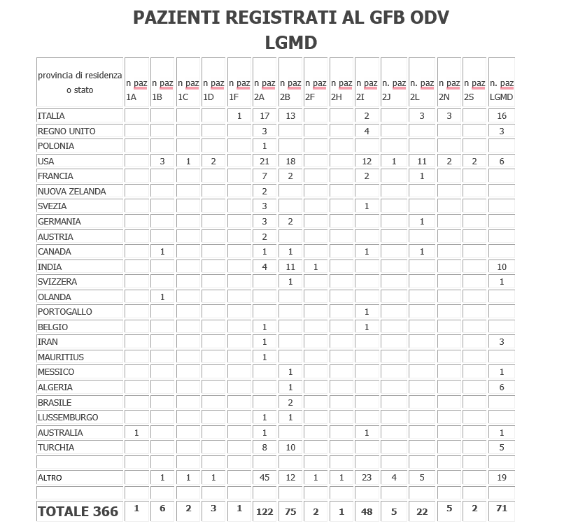 Questo sito e il relativo gruppo di auto-mutuo-aiuto GFB ONLUS sono nati dal desiderio di conoscere altre famiglie coinvolte da questa patologia (sul territorio italiano ce ne sono una cinquantina), per condividere i vari aspetti del dover vivere ogni giorno con questa malattia, aspetti clinici, legislativi, logistici, organizzativi, legati alla ricerca scientifica e all’utilizzo dei vari ausili. Abbiamo intenzione di realizzare una nostra prima raccolta di dati su questi pazienti, in vista di un futuro registro pazienti e di specifici trial clinici.